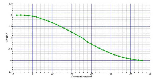 График, изображенный на рисунке2.12,показывает изменение аргумента полярной координаты первого шара sin(φ1), по которому оценивалась корректность вычислений.