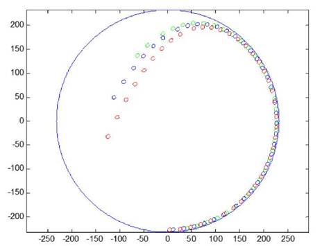 Рисунок 2.14 Траектории движения трёх мелющих тел в барабане. Зелёный цвет - траектория первого шара, синий цвет - второго, красный - третьего шара (крайнего)