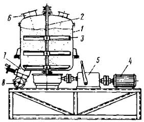 6 - крышка смесителя; 7 - рычаг заслонки; 8 - выгрузной патрубок;