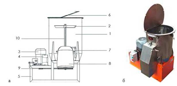 а - схема смесителя, б - общий вид смесителя: 1 - камера смесителя; 2- лопасти вертикального вала; 3 - электродвигатель; 4 - блок управления смесителем; 5 - рама;