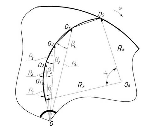 Криволинейную дугу лопасти ротора разобьем на «j»количество прямолинейных ломаных линий (см. рис. 2.1), начиная от точки поступления частицы материала на поверхность криволинейной лопасти.