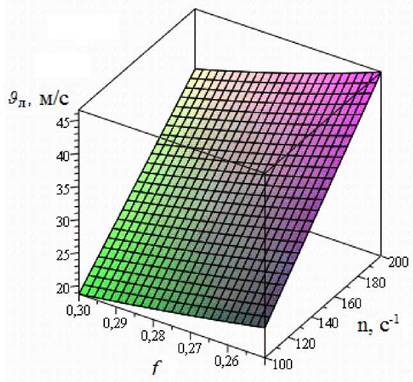 Рисунок 2.2. Зависимость скорости движения частицы по поверхности криволинейной лопасти от коэффициента трения fи частоты n вращения ротора