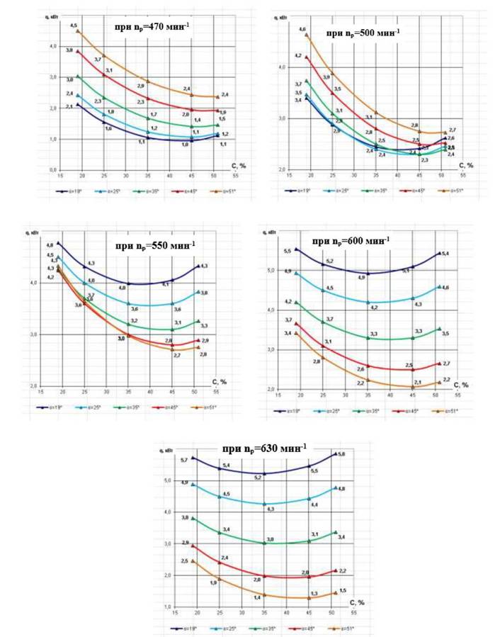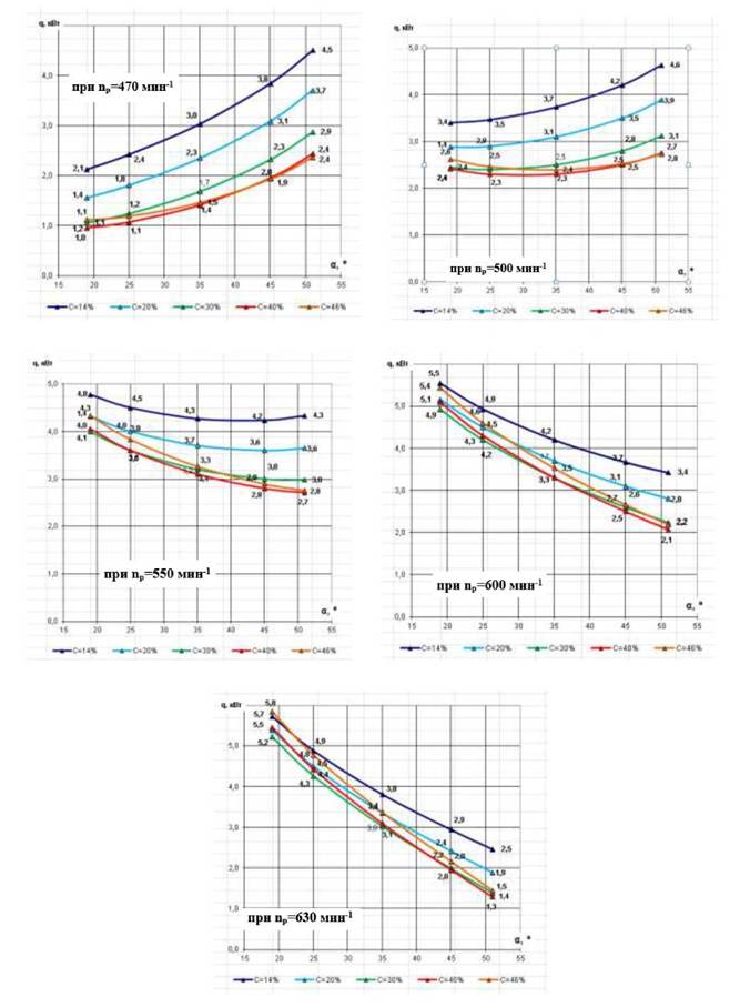 Рисунок 6.4. Графики зависимости удельного расхода электроэнергии qот угла атаки лопасти вертикального вала С, при изменении величины «живого сечения» винтовых лопастей барабана С.