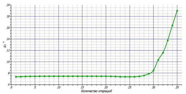 Здесь мы видим, что значение угла изменяется только на последних итерациях (начиная с 28), до этого значение постоянно; его можно проверить исходя из геометрии барабана и шаров (в данном случае оно эквивалентно 7,5°).Подобная картина наблюдается и в случае изменения угла χ2третьего шара относительно второго