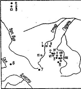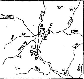 Гробницы в курганах: 1 - Городище, 2 — Пересопница, 3 - Белев, 4 - Сгарожуков, 5 ~ Понебель, 6 - Судовая Вишня, 7 - Подгорцы, 8 - Коростень, 9 - Ленино, 10 - Ягнятин, 11 — Вышгород, 12 - Совки, 13 — Жуляны, 14 - Киев, 15 - Китаев, 16 - Клонов, 17 - Седнев, 18 - Толстолес, 19 - Табаевка, 20 - Чернигов,21 - Гущин,22 - Шестовица, 23 -Левинки,24 - Кветунь.