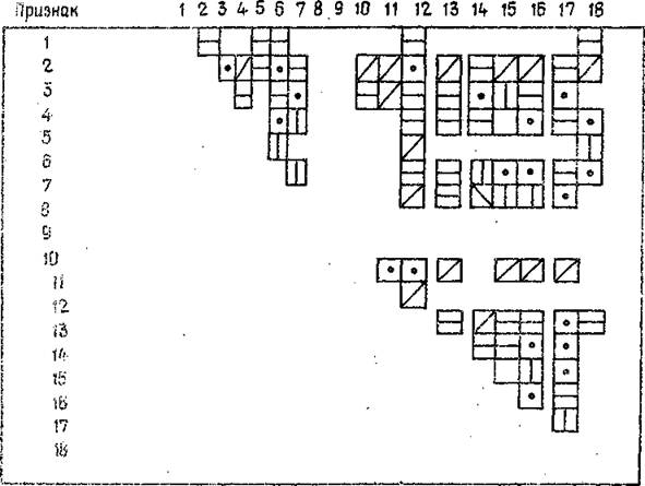 Признаки: 1 —. керамика в насыпи; 2 - керамика в могиле; 3 — другие емкости; 4 - ножи; 5 - кресала и кремни; 6 — оселки; 7 - гирьки и весы; 8 - ларцы; 9 - орудия труда; 10 - оружие и доспехи; 11 - снаряжение коня; 12 - элементы костюма; 13 - украшения; -14 — туалетные принадлежности; 15 - принадлежности для игр; 16 - амулеты и кресты; 17 — монеты; 18 - сумки.