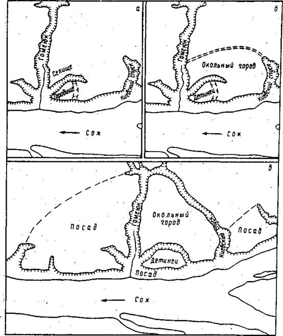 а - поселение VI-IX вв., б - городе Хв.; в - город в ХІ-ХІІІ вв. (очертания укреплений отражают ситуацию ХП в.).
