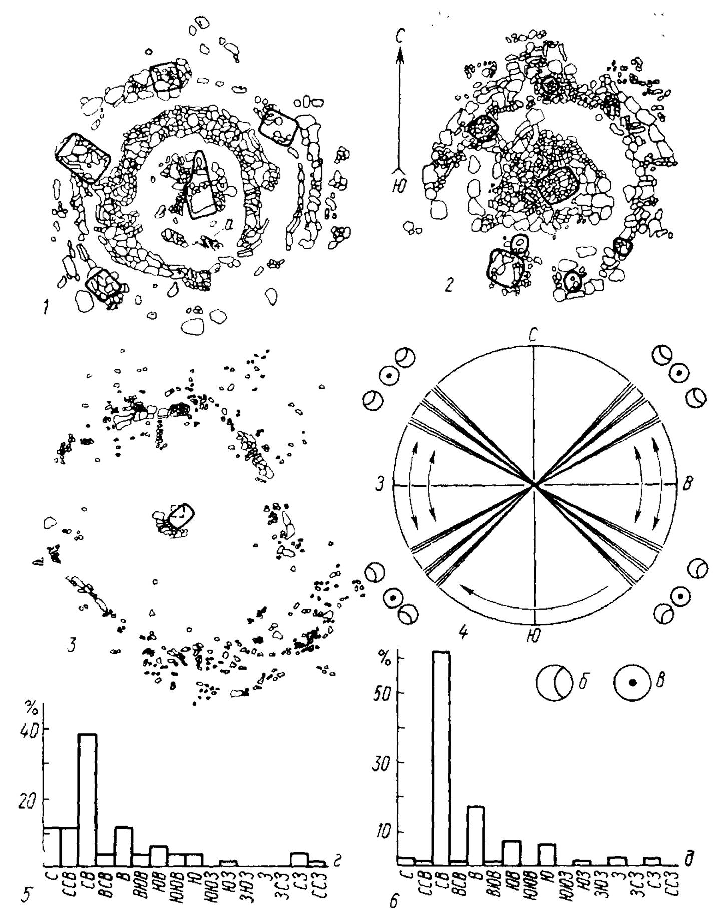 Рис. 2.7 — 3 — планы курганов 1-12, ІІ-2, 1-9 в Усатово. а — Погребение на древнем уровне; 4 — распределение по сторонам горизонта азимутов точек восходов и заходов Солнца и Луны при минимальных и максимальных склонениях, б — Лупа, в — Солнце; 5, 6— ориентировка погребенных по сторонам света, г — Выхватинцы, д — могильники усатовского типа.