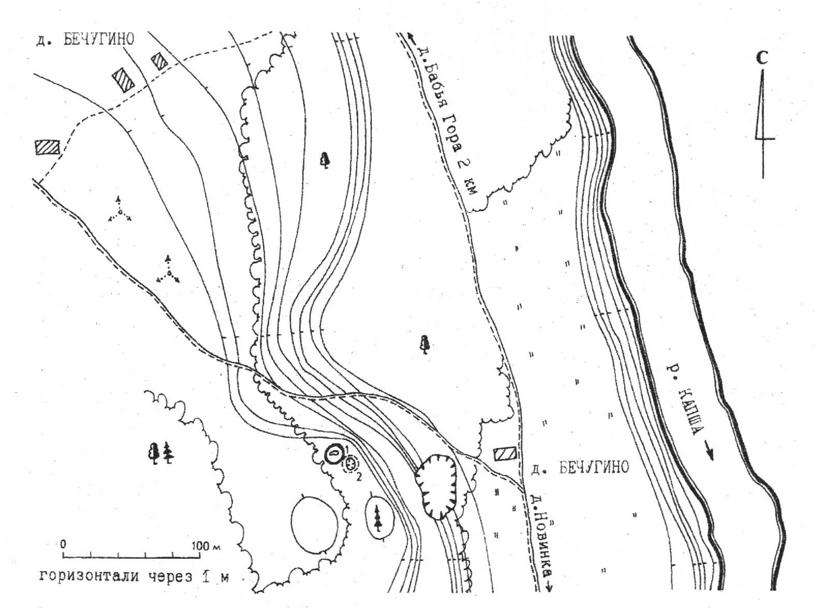 1104. Бечугино-2. Курганная группа в 0,1 км к западу от южной части бывш. д.Бечугино, в 0,25 км от правого берега р.Капша, на третьей надпойменной террасе. В 1937 г. отмечена 1 насыпь, в 1988 г. зафиксированы 2 насыпи: № 1 выс. 1 м, диам. 10 м, повреждена грабительской ямой, насыпь № 2 почти полностью разрушена [72, л.З об.; 208, л.9; 219, л.6; 247, л. 14—15; 463, с.92].