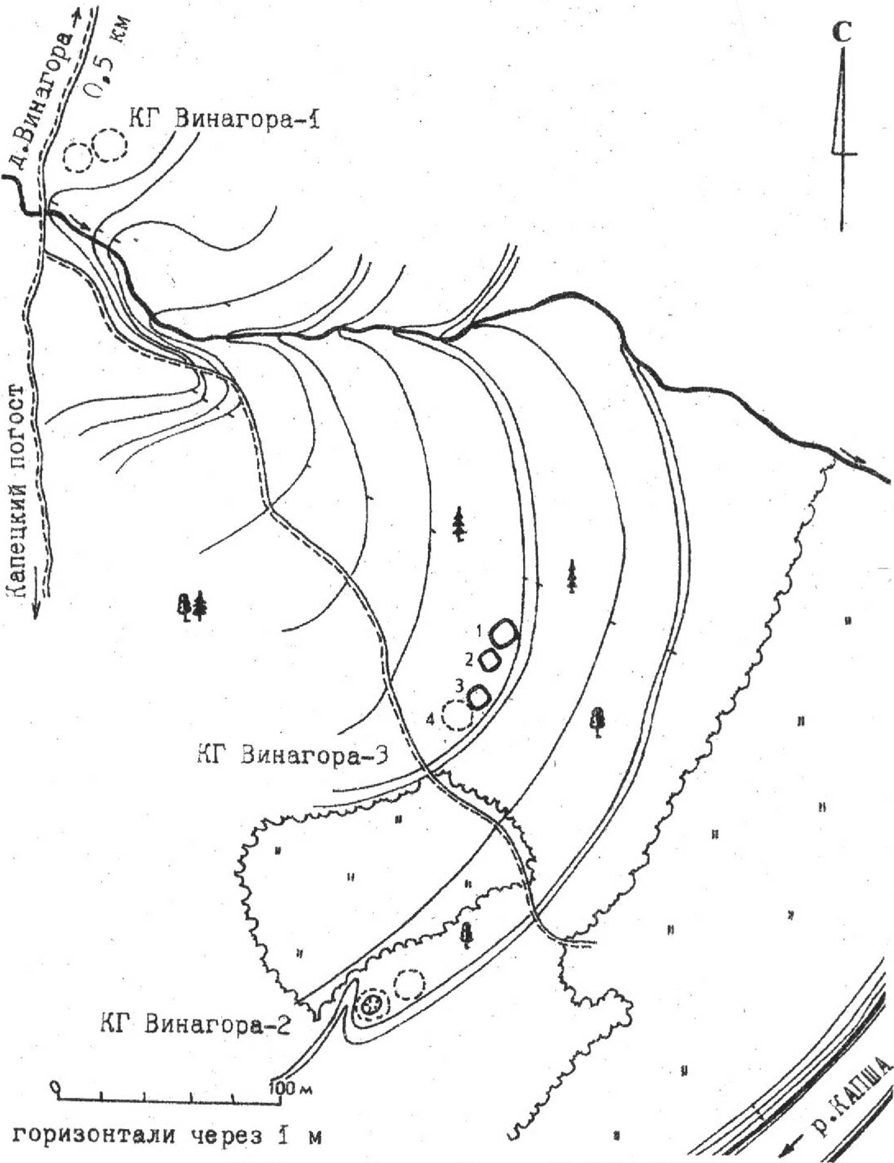 1131. Винагора-1. Курганная группа в 0,5 км к югу от д.Винагора, на третьей надпойменной террасе правого берега р.Калша, в 0,5 км от воды, в 30 м к северо-востоку от места пересечения проселочной дороги из д.Винагора на Капшинский погост с ручьем Каменик. В 1970 г. зафиксированы 2 насыпи, в настоящее время разрушенные [208, л.7; 219, л.4—5; 247, л. 16; 463, с.80].