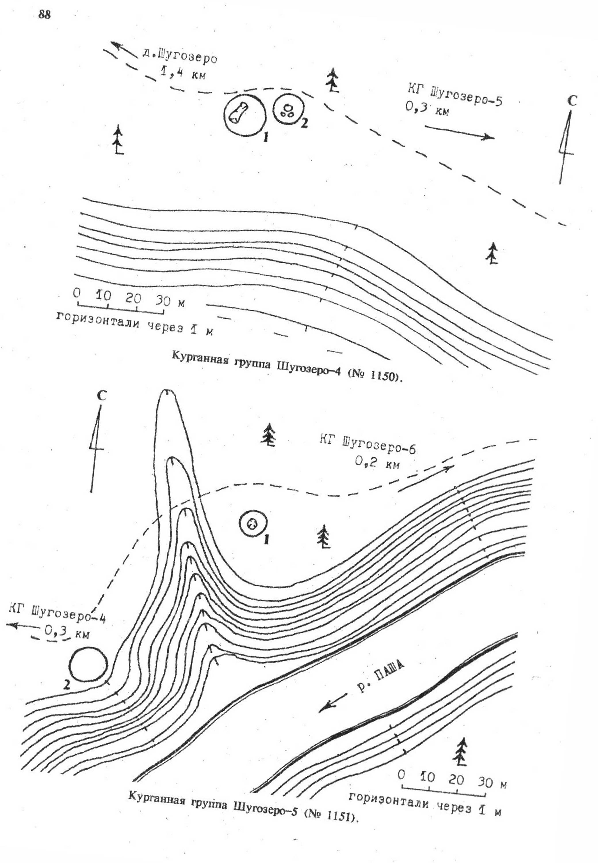 1147. Шугозеро-1. Курганная группа в 1,5 км к югу от центра пос.Шугозеро, в 1 км вниз по течению к западу от моста через р.Паша и дороги Шугозеро — Палуя, у бывш. д.Равдина. Три кургана находились на левом крутом берегу реки и четвертый — на правом берегу. 3 кургана раскопал в 1973—1974 гг. И.П.Кру- пейченко.
