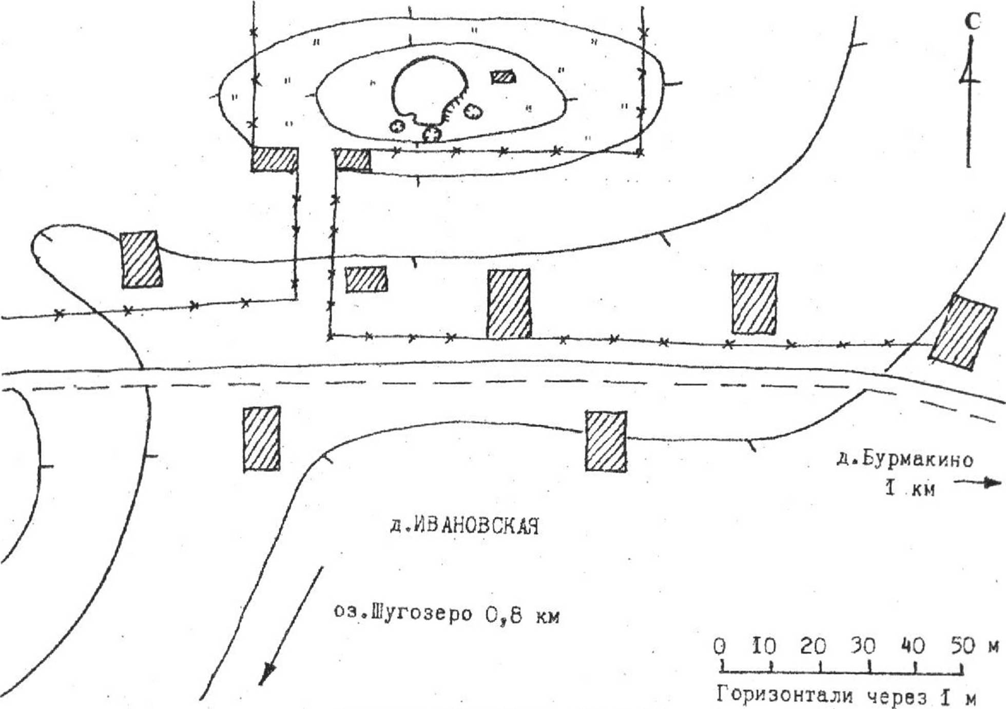 1155. Ивановская. Курган на северной окраине центральной части д.Ивановская, в 0,8 км от берега оз.Шугозеро, на песчаной возвышенности, среди огородов. Впервые отмечен в 1911 г., обследовался в 1937 и 1988 гг. Насыпь выс. 2,5 м, диам. 14 м с уплощенной вершиной [72, л.З; 247, л.12; 564, с.84].