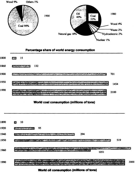 Быстро росли промышленное производство и добыча минералов, потребление электричества росло даже еще быстрее, а вдобавок с огромной скоростью возрастало использование транспортных средств. Ho все это было бы невозможно без увеличения потребления энергии. B течение XX века мировое потребление энергии возросло в тридцать раз. XIX век являлся эпохой каменного угля, и промышленное производство не могло расширяться без его использования. B девяностые годы