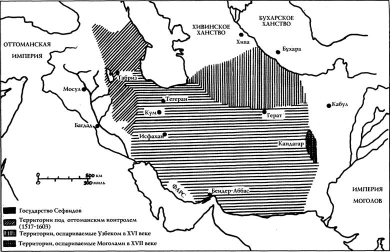 B ней нашлось место также целому ряду идей, заимствованных и из буддизма, и из зороастризма, но в целом эту систему следует назвать агрессивно-шиитской и анти-суннитской. Кульминация этого процесса была достигнута при Исмаиле, который возглавил движение в 1487 году — он объявил себя тайным имамом и воплощением Аллаха.B 1501 году Исмаил занял Тебриз в северо-восточном Иране и принял титул шаха. До конца десятилетия он подчинил весь Иран. Именно в этот период были определены границы современного Ирана: Оттоманская империя контролировала Анатолию, а империя Сефевидов — Трансоксанию (области за Аму-дарьей) на востоке. Важнейшей задачей для Сефевидов стало создание централизованной политической структуры в Иране (каковой не существовало уже более ста лет), с целью восстановления экономики и социальной инфраструктуры (во многих отношениях все еще страдавших от последствий монгольского вторжения двухсотпятидесятилетней давности). Также следовало удерживать в повиновении кизилбашей, фактически завоевавших Иран для Сефевидов. Кизилбаши являлись, по сути, племенными вождями, у них имелись свои