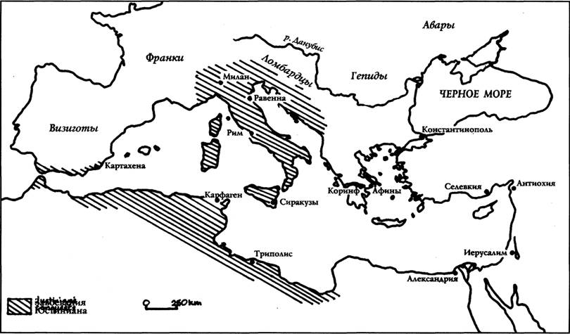Наследие Юстиниана тоже было глубоко сомнительным. Он преуспел в повторном завоевании Северной Африки — но следствием этого стало навязывание грекоговорящей администрации (как и на остальном востоке) в районе, который при предыдущем императоре всегда был латиноговорящим. Попытка вновь завоевать Италию привела к разрушительной двадцатилетней войне, которая уничтожила большую часть остававшейся еще старой римской элиты и римских институтов. B конце концов многие сенаторские семьи уехали на восток и осели в латиноговорящей колонии в Константинополе.