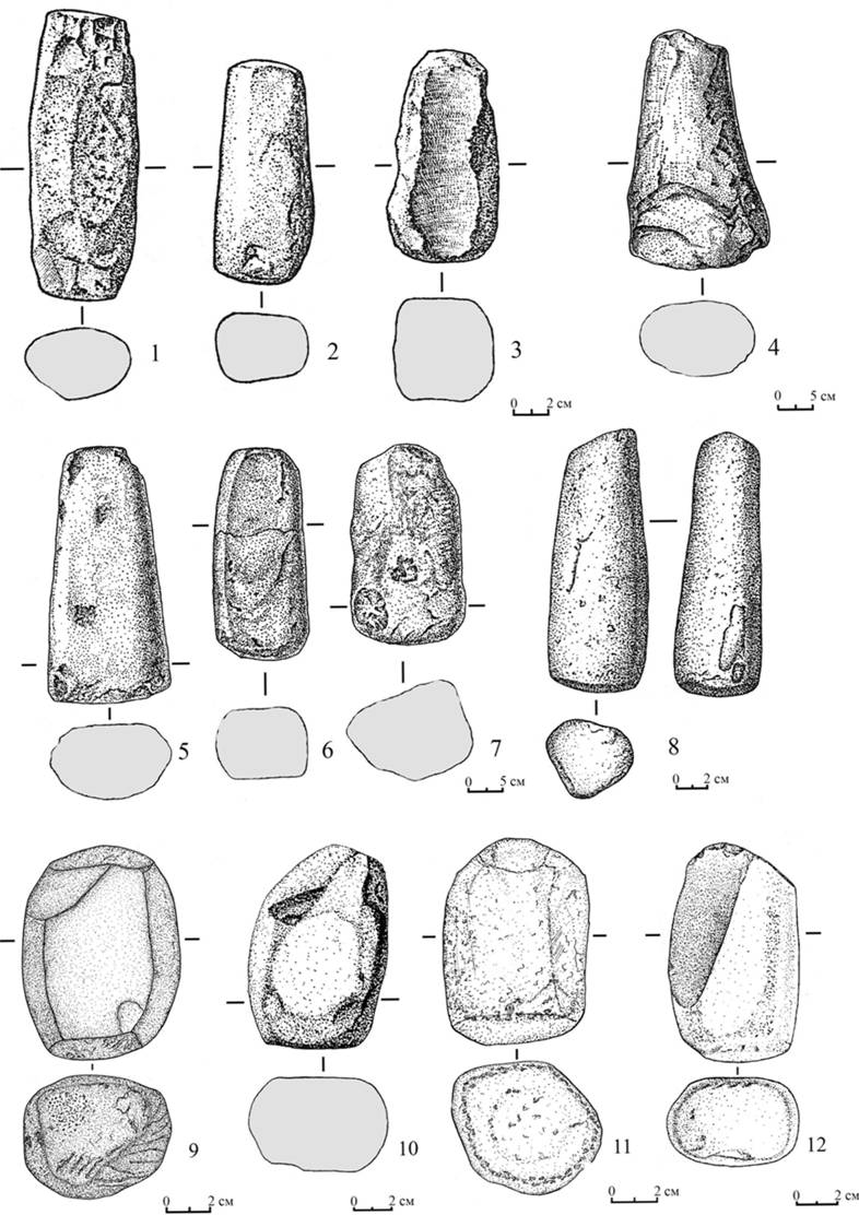 6-8 - ножи, 9-нож-пила, 10-топор, 11-крестовидная подвеска (6-11-бронза).