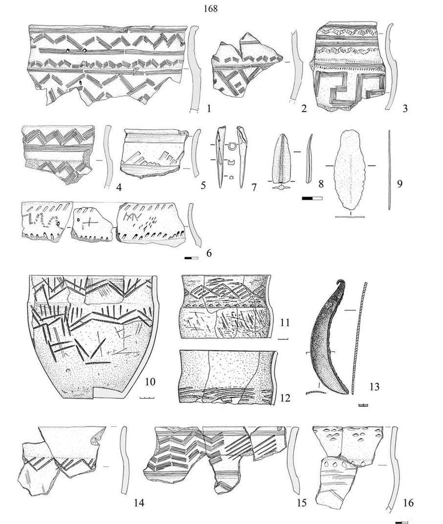 II- 13 - Поселение Лебяжье VI. 11-12- сосуды, 13- бронзовый серп.
