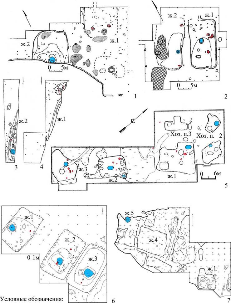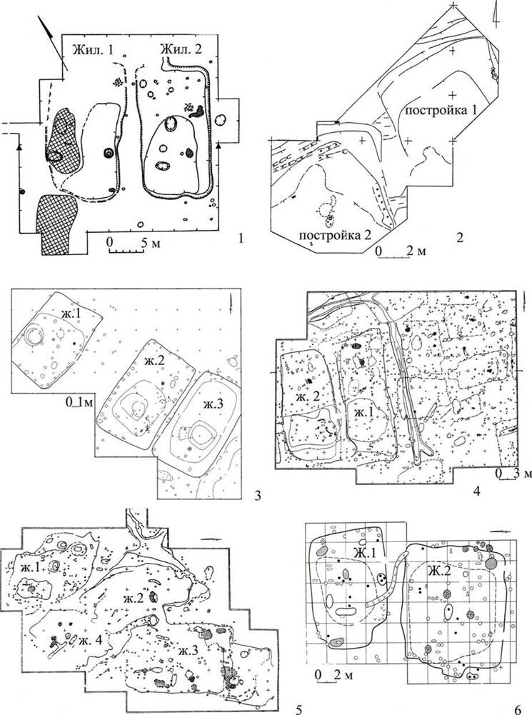 Рис. 3. Планы поселений бронзового века степной зоны Южного Зауралья. Рис. 4. Парное расположение построек позднего бронзового века.Рис. 5. Постройки многослойных поселений Южного Зауралья.