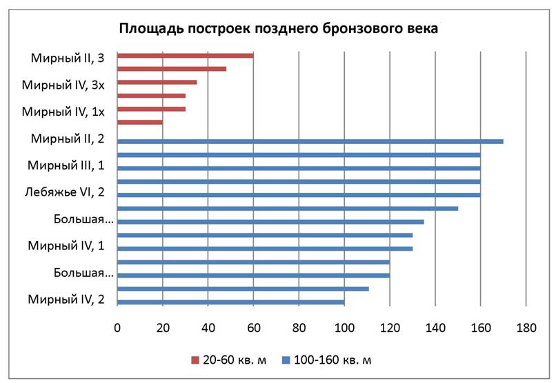 Рис. 6. Постройки позднего бронзового века степной зоны Южного Зауралья. Рис. 7. Гистограмма «Площадь построек позднего бронзового века» по материалам поселений степной зоны Южного Зауралья.