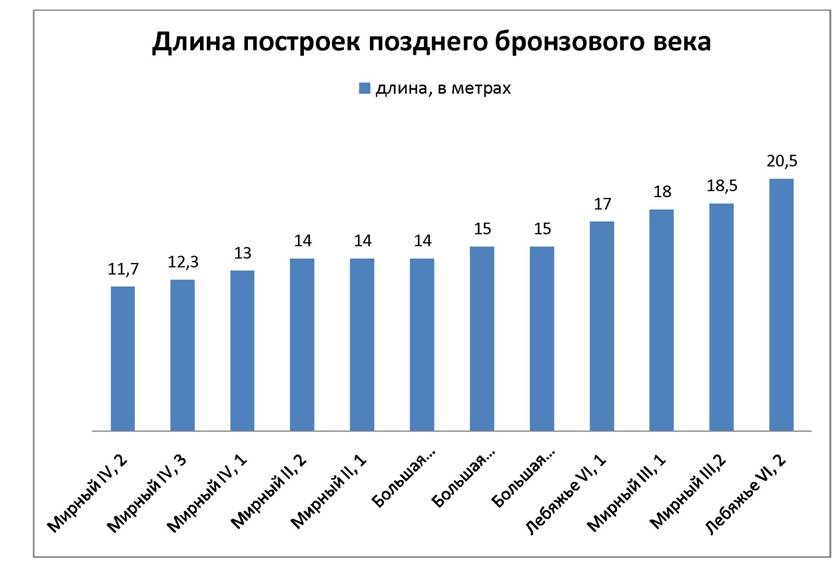 Рис. 9. Гистограмма «Длина построек позднего бронзового века» по материалам поселений степной зоны Южного Зауралья.