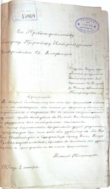 Подання студента III курсу юридичного факультету Семена Садовня на ім’я ректора Київського університету з проханням дозволити складання іспиту в січні 1916 р. На звороті цього документа П. Соколов зробив необхідні для його наукових прань нотатки. Писаний чорнилом текст просвічується внизу ліворуч