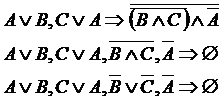 | 3 | Правила утверждения-отрицания (Modus Ponendo-Tollens) | Если справедливо или высказывание А, или высказывание В (в разделительном смысле) и истинно одно из них, то другое ложно | ![]() |