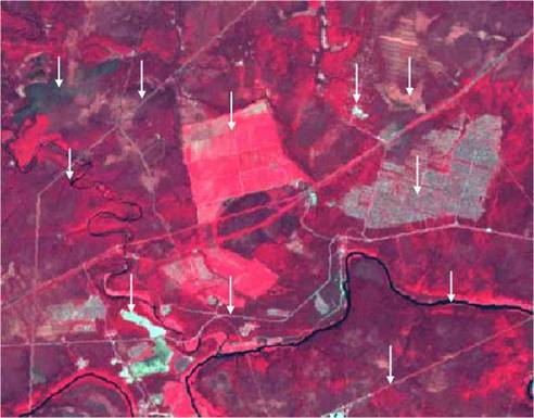 дороги, вырубки, карьеры, сельскохозяйственные поля, хорошо распознаются на космических снимках (рис. 2).