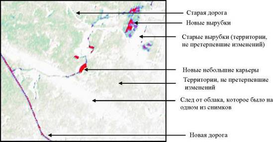 Разностное изображение представляет собой результат обработки двух космических снимков, в результате которой становятся хорошо видны все изменения, которые претерпели природные объекты в результате деятельности человека или природных процессов. Различными цветами на разностном изображении показаны изменения различной интенсивности. Так, участки территории, связанные с вырубкой леса, имеют красный и синий (фиолетовый) цвет.