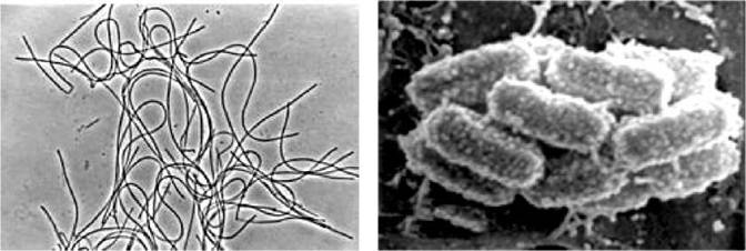 Рис. 55. Представители зеленых бактерий: Chloroflexus (слева) и Chlorobium (справа)