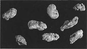 3.21. Белесые известковые мелкие угловатые конкреции из профиля черноземовидной луговой глееватой глинистой почвы поймы р. Дон. Тульская областьразмер которых не превышает 0,5-1,0 см (рис. 3.21). Их химические свойства весьма близки к свойствам крупных белесых известковых конкреций (табл. 3.19).