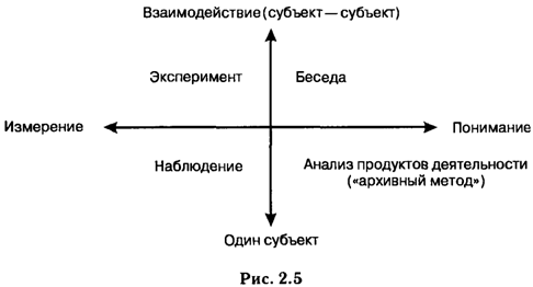В квадратах, образованных этими осями, можно расположить основные психологические эмпирические методы (рис. 2.5).