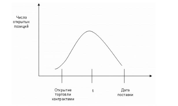 количество существующих контрактов начинает резко падать, поскольку хеджеры и спекулянты, как правило, не заинтересованы в осуществлении поставки. Поэтому при приближении срока истечения контрактов они начинают активно закрывать свои позиции. На дату поставки остается лишь небольшое число контрактов.