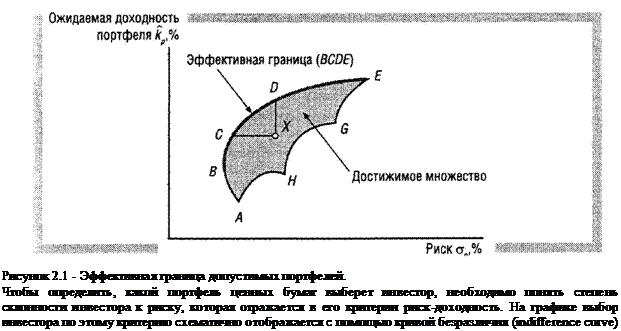 На рисунке 2.1 представлено множество допустимых портфелей ценных бумаг. На рис. 2.1 граница области, заключенная между точками BCDE. определяет эффективное множество портфелей ценных бумаг, которое также и называется эффективной границей (efficient frontier). Портфели, расположенные слева от эффективного множества, недостижимы. Портфели же. расположенные справа от границы (внутренние), неэффективны, поскольку в этом случае найдутся другие портфели с тем же риском, но более высокой доходностью либо той же доходностью, но меньшим риском. Например, портфели ChD являются более предпочтительными по критерию «риск-доходность», чем X.