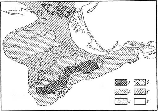 Рис. 50. Палеогеографическая схема Крыма в среднем плиоцене 1 — возвышенности Крымских гор; 2 — область пологих склонов я предгорных гряд, а также районы Тархаикутского и Керченского полуостровов, где іможно предполагать формирование почвенных красноземов на продуктах выветривания коренных пород; 3 — речные ложбины, заполнявшиеся аллювием; 4 — отложеняя селевых потоков (массандровские отложения) в верховьях эрозионных ложбин; 5 — область накопления пролювиальных отложений в предгорных равнинах, покрытых почвенными