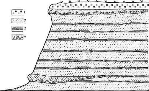 Рис. 51. Строение таврской свиты в обрыве близ устья р. Альмы / — четвертичные суглинки; 2 — желтые алевриты; 3 — конгломераты и песчаники; 4 — горизонты почв красноземов