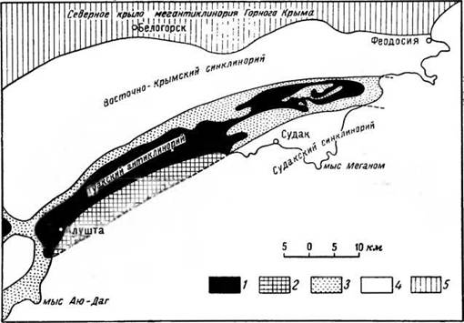 рек Шелен — Ворон. Наиболее крупной структурой из них является Алуштинская антиклиналь, расположенная в области резкого изгиба всех структур горного Крыма, где происходило смыкание ядер Качин- ского и Туакского поднятий и сочленение Юго-Западного и Восточно- Крымского синклинориев.