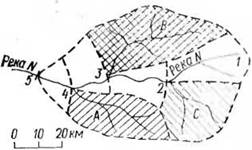 ЩАДИ ВОДОСБОРА — графическое изображение постепенного увеличения площади водосбора по мере нарастания длины реки от истока, к устью. На таком графике по оси абсцисс откладывается длина главной реки в ,принятом масштабе, а по оси ординат — площади водосбора главной реки между притоками и площади бассейнов притоков. Постепенное нарастание площади водосбора главной реки в местах впадения притоков сменяется резким увеличением водосбора, что на графике отмечается отрезком вертикальной линини в принятом масштабе, соответствующем величине площади водосбора притока. Иногда построение Г. н. п. в. ведется раздельно для правобережной и левобережной частей водосбора.