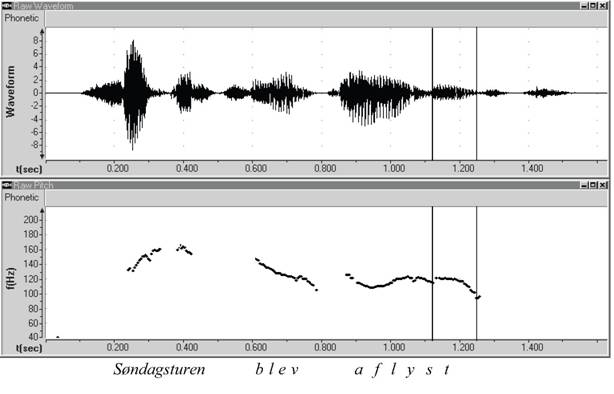 В примере же (5) на конечном ударном слоге ремы в словоформе aflysts, мы наблюдаем только падение. Этот пример также полностью согласуется с положениями датской интонологии о структуре тактовой группы. Гласный конечного ударного слога взят в курсоры (речь информанта Г.). Попутно заметим, что начальная словоформа предложения sandagsturen 'воскресная прогулка’ исполняется информантом как тема: мы видим подъем на ударном