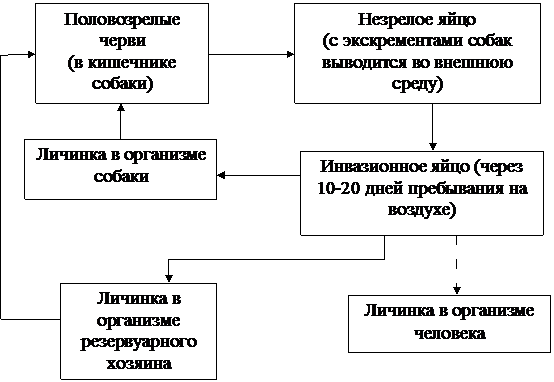 С учетом возможного участия насекомых в качестве резервуарных хозяев, цикл развития трихины может быть представлен в виде следующей схемы.