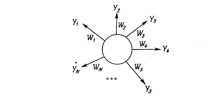 Входная звезда, как показано на рис. Б.1, состоит из нейрона, на который подается группа входов через синапсические веса. Выходная звезда, показанная на рис. Б.2, является нейроном, управляющим группой весов. Входные и выходные звезды могут быть взаимно соединены в сети любой сложности; Гроссберг рассматривает их как модель определенных биологических функций. Вид звезды определяет ее название, однако звезды обычно изображаются в сети иначе.