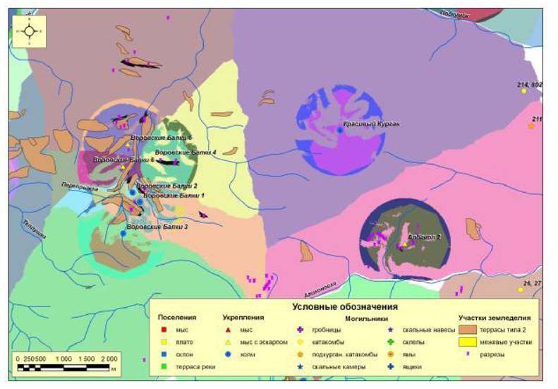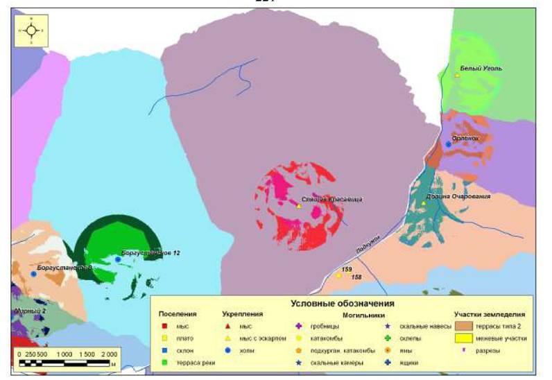 Рис. 202. Ресурсные зоны с потенциальными пахотными угодьями поселений первого хронологического периода микрозоны 1 (левый берег р.