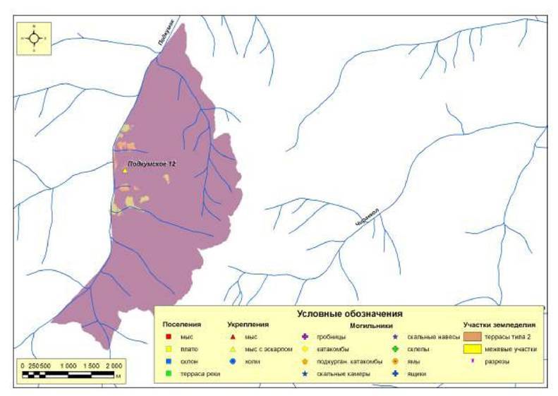 Рис. 232. Ресурсные зоны с потенциальными пахотными угодьями поселений второго хронологического периода микрозоны 1 (левый берег р. Подкумок)
