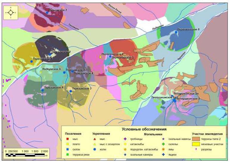 Рис. 220. Ресурсные зоны с потенциальными пахотными угодьями поселений первого хронологического периода микрозоны 6 (правый берег р. Березовая - левый берег р. Кабардинка - левый берег р. Кич-Малка)