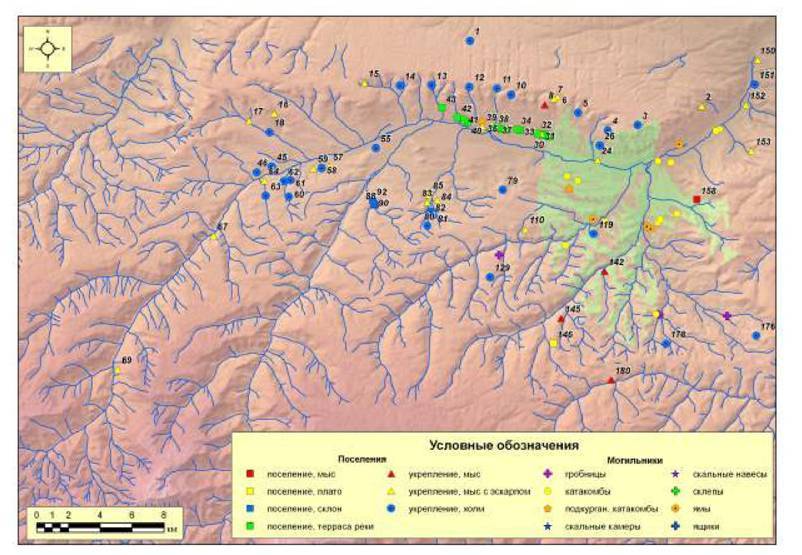 Рис. 227. Поселения и могильники Кисловодской котловины второго хронологического периода (V-VIII вв. н.э.)