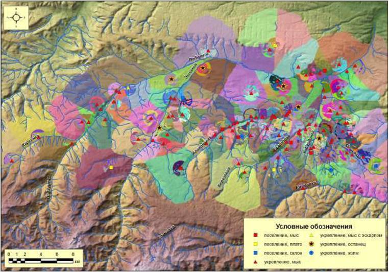 Рис. 230. Результат пространственного анализа потенциальных ресурсных зон вокруг поселений Кисловодской котловины второго хронологического периода (V-VIII вв. н.э.) с выделением минимальных и максимальных потенциальных пахотных угодий