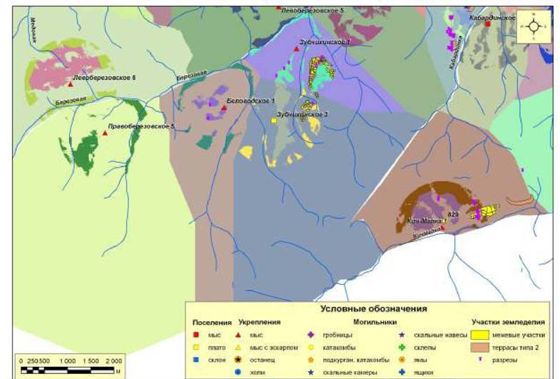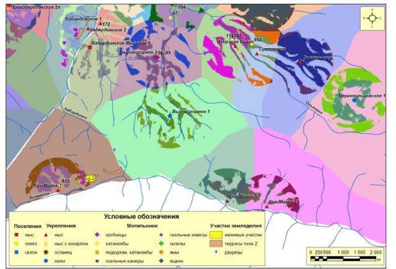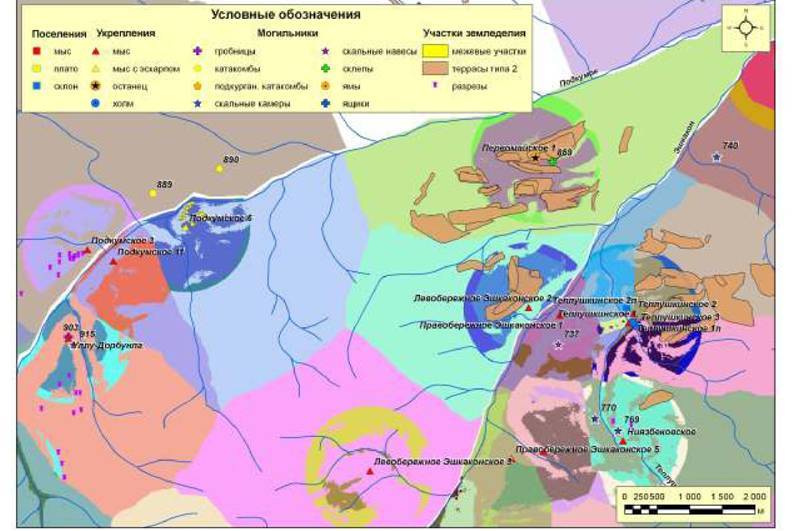 Рис. 252. Ресурсные зоны с потенциальными пахотными угодьями поселений второго хронологического периода микрозоны 6 (правый берег р. Березовая - левый берег р. Кабардинка - левый берег р. Кич-Малка)