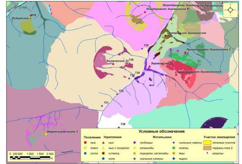 Рис. 244. Ресурсные зоны с потенциальными пахотными угодьями поселений второго хронологического периода микрозоны 4 (правый берег р. Подкумок - правый берег р. Эшкакон - левый берег р.