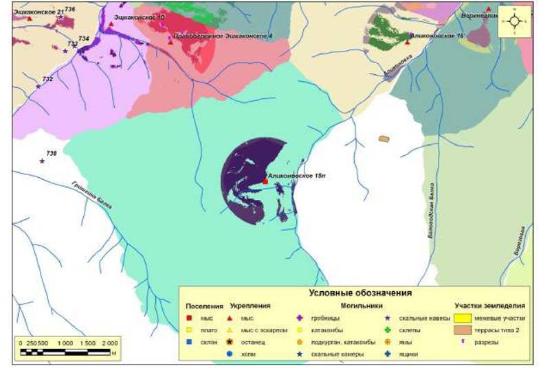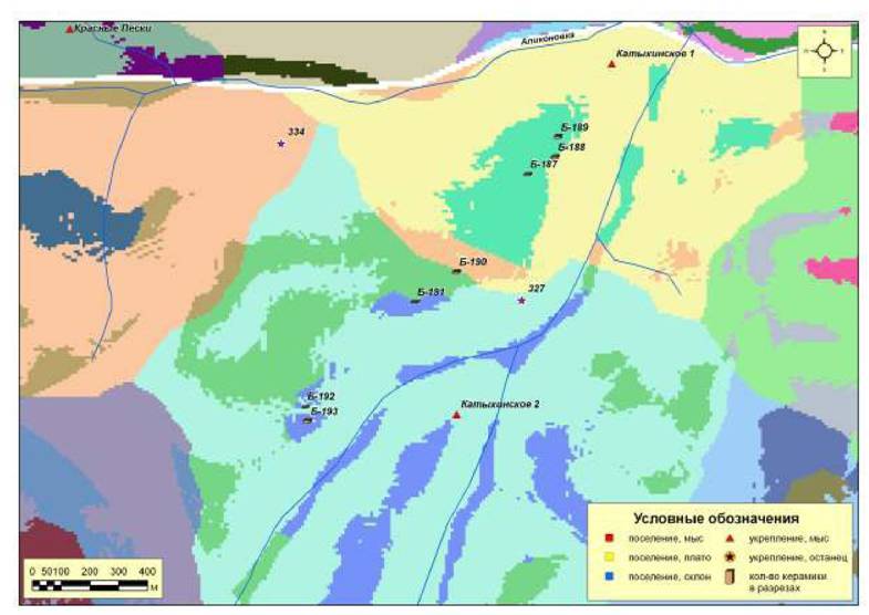 Рис. 246. Ресурсные зоны с потенциальными пахотными угодьями поселений второго хронологического периода микрозоны 5 (правый берег р. Аликоновка - левый берег р. Березовая)