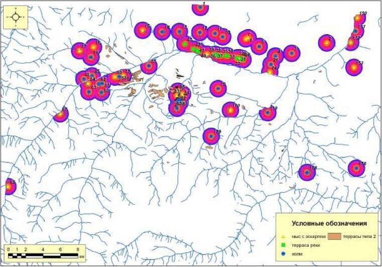 Рис. 235. Ресурсные зоны с потенциальными пахотными угодьями поселений второго хронологического периода микрозоны 1 (левый берег р.