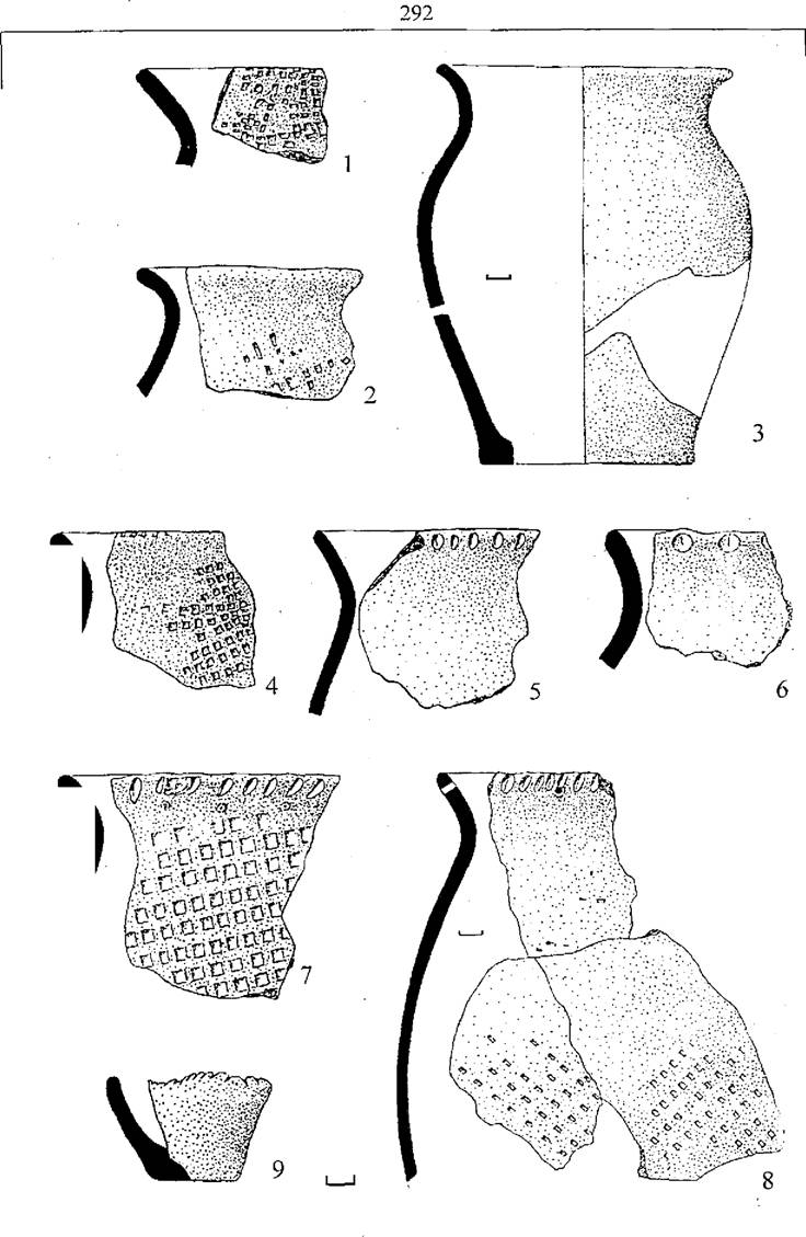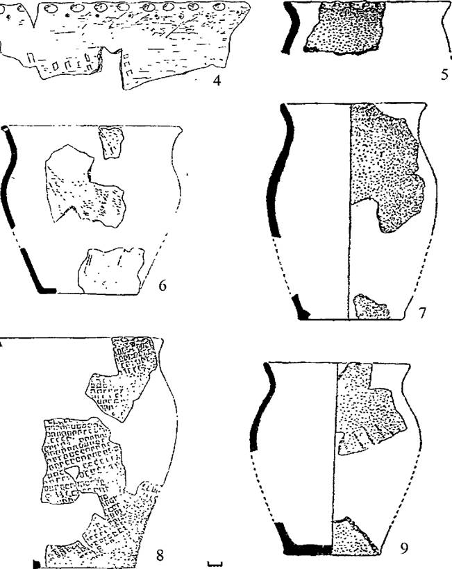 Рис. 38. Керамический комплекс городища Малый Липяг. 1 -3 - горшки тип I, 4-8 - горшки тип II, 9 - чашка.
